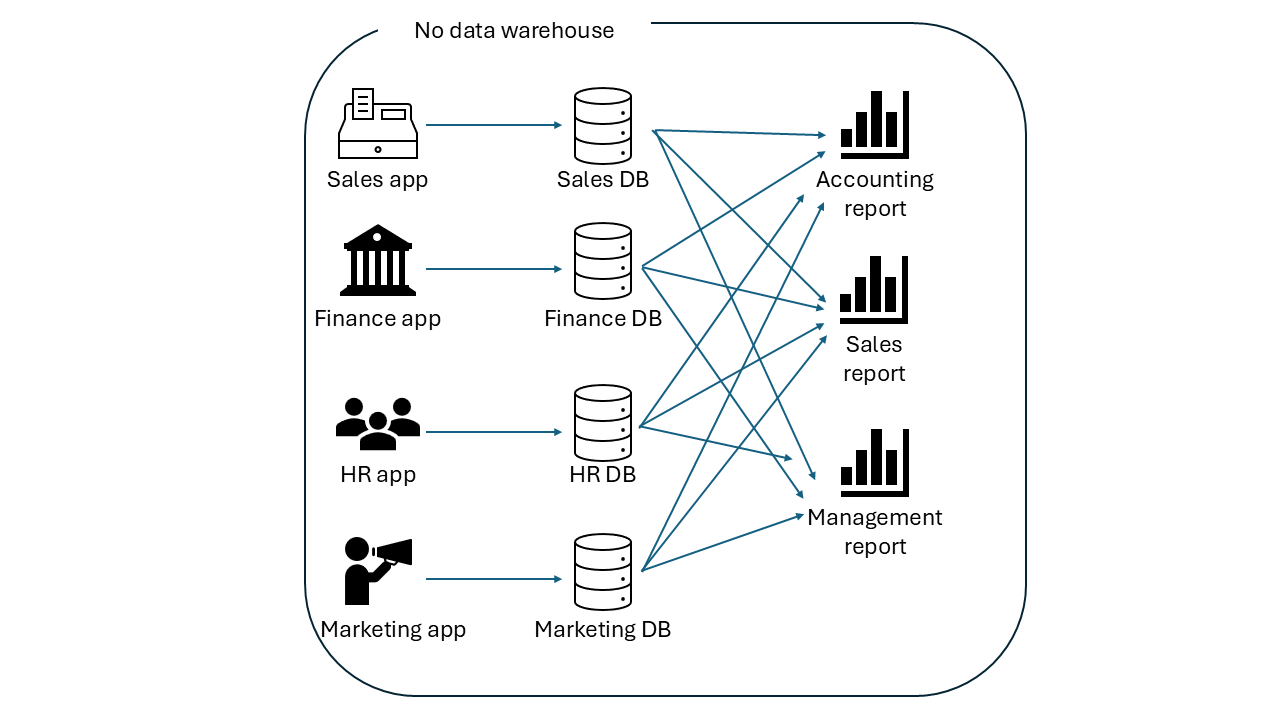 The illustration below best describes the need to implement a data warehouse. You may notice how complicated and inefficient it is to run a report that retrieves the data from multiple applications, where each business unit creates a report that retrieves the data from all the databases connected with each application. It’s fair to say that this is total chaos.