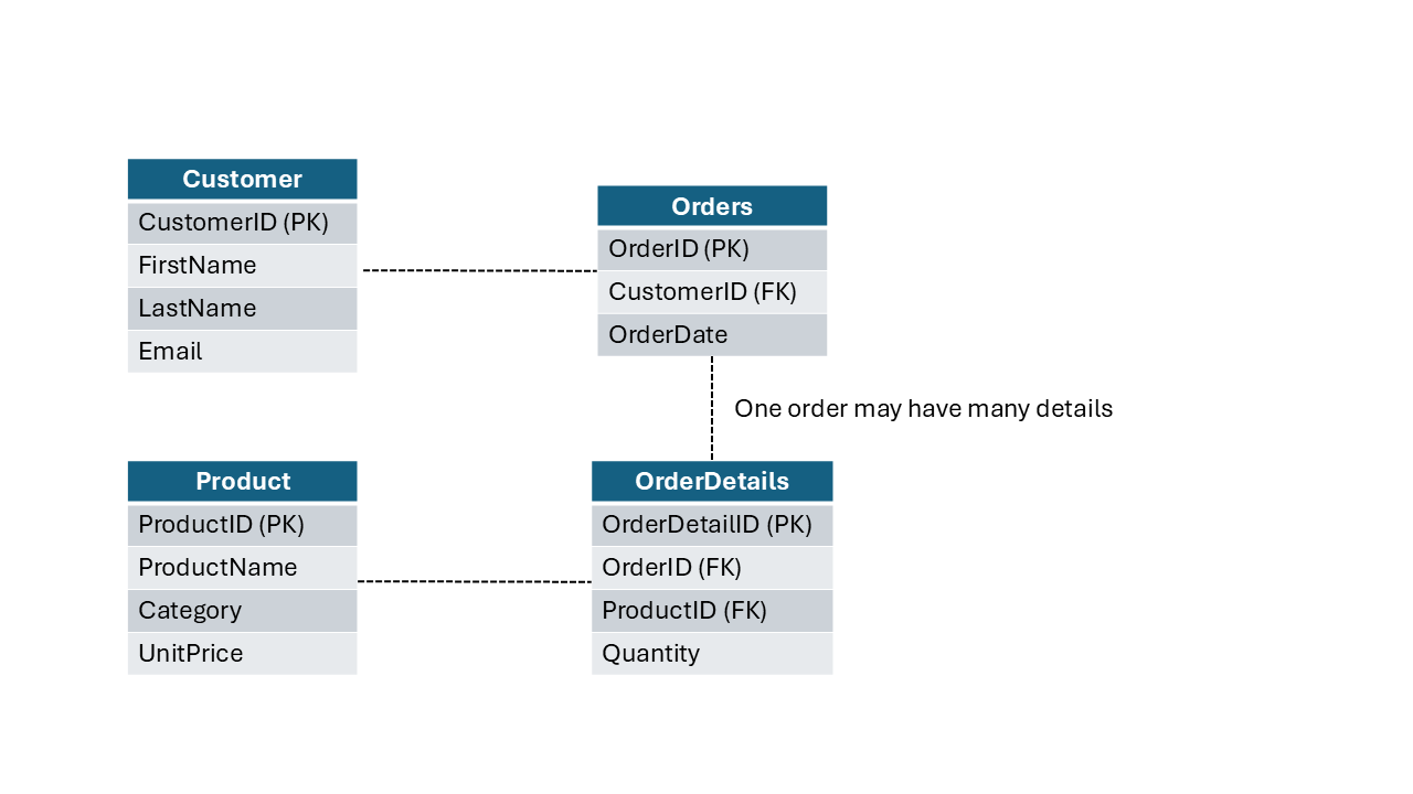 Let’s break down a typical relational database structure. Figure below displays a simplified relational model that consists of four tables: Customer, Product, Orders, and OrderDetails.