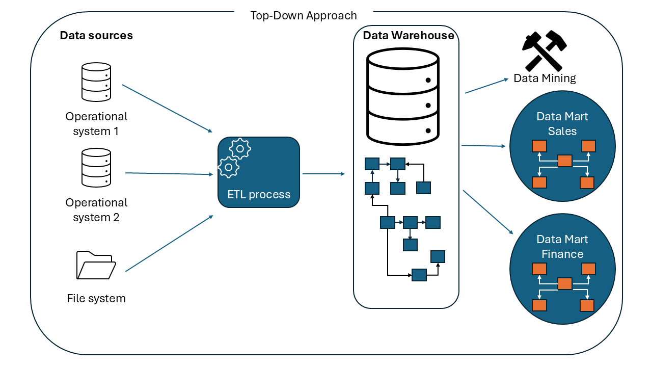 This method was introduced by Bill Inmon, widely recognized as the father of the data warehouse. It begins with building a centralized, company-wide data warehouse. The data is normalized to avoid redundancy. This centralized repository serves as a single source of truth for managing and analyzing the data across the entire organization.