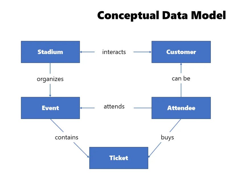 Let’s look at a real example - events at a stadium. In a conceptual model for this scenario, you’d identify several entities: Stadium, Event, Customer, Attendee, and Ticket. You’d also notice how these entities are interconnected. This high-level overview provides a simplified picture of the business workflow within the organization.