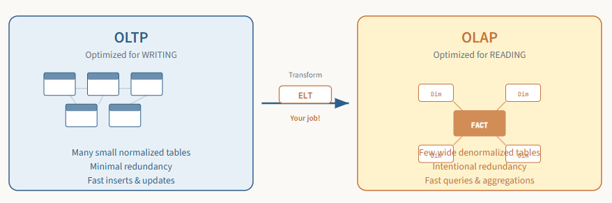 This leads us to the core job of an analytics engineer: transforming data from a model optimized for writing (OLTP) to one optimized for reading (OLAP).