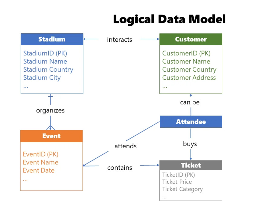 A Stadium has a name and is located in a specific country and city, which uniquely identifies it. This Stadium may host many events, and there can be many attendees coming to these events. An Event cannot exist outside of the Stadium where it is scheduled. An event can be attended by an attendee, and there can be many attendees for one event. An Attendee is the entity that attends the event. They can also be a Customer of the Stadium entity - for example, by visiting a stadium museum or buying at a fan shop - but that doesn’t make them an attendee of a specific event. Finally, a Ticket represents confirmation that the attendee will attend a specific event. Each Ticket has a unique identifier, and one Attendee can purchase multiple Tickets.