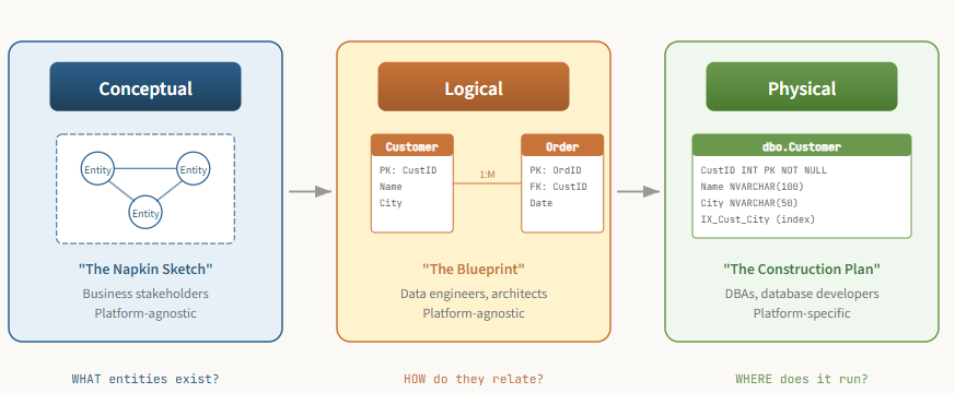 Why bother with all three? Because fixing a gap in the conceptual model costs a conversation. Fixing it in the physical model costs a sprint. The earlier you catch issues, the cheaper they are to resolve.