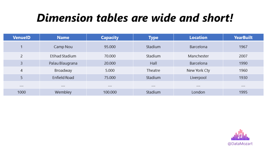 Dimension table structure – A dimension table should always contain a single primary key column, which is used as a foreign key in a related fact table. Dimension tables are usually wide and short (many columns, less number of rows, although there are dimensions with multimillion rows). Dimension tables are denormalized, containing usually text attributes and descriptions