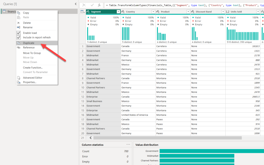 So, let’s start with the Segment column first. I’ll first duplicate the original “financials” table. I’m not referencing it in the Power Query, because I’ll need to perform merge operations at the later stage.