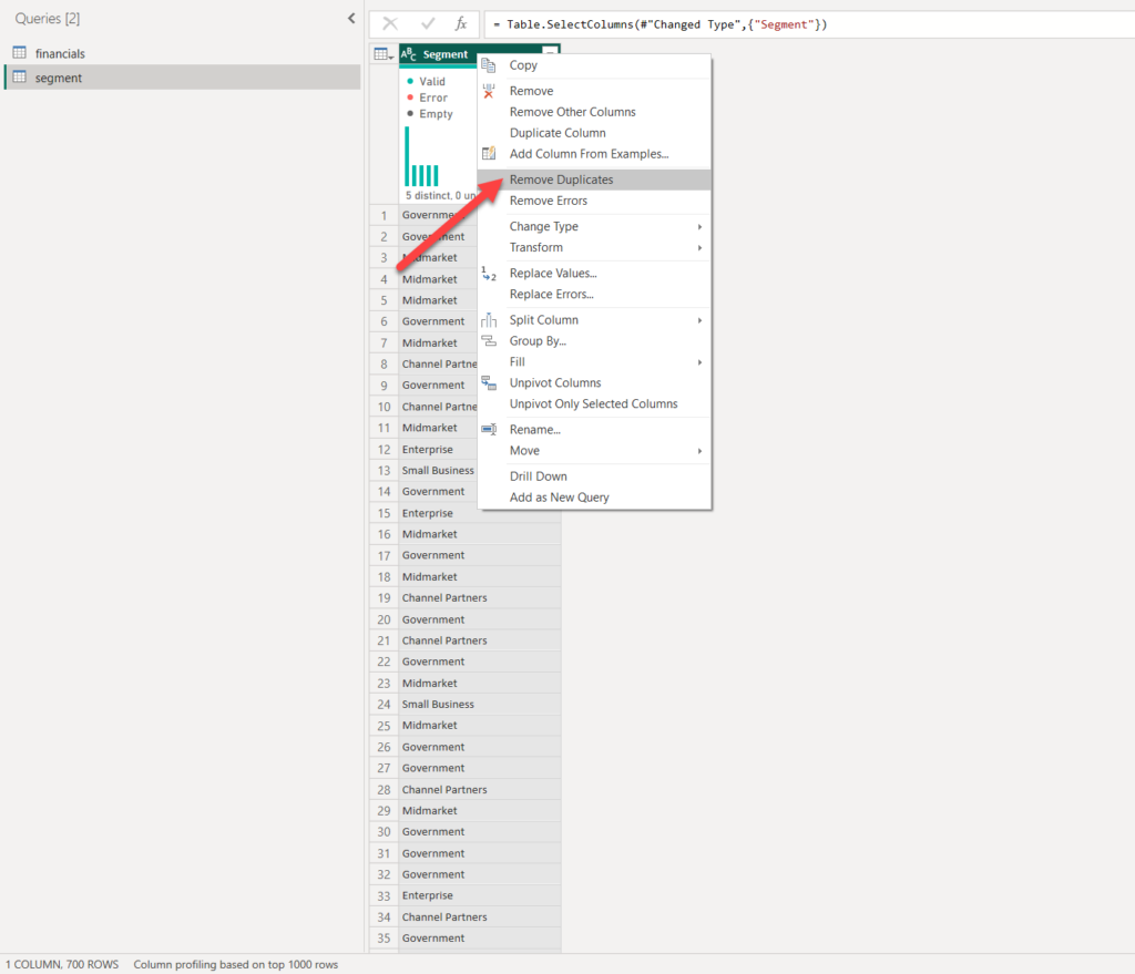 Once the Segment is the only column remaining in this table, I’ll again right-click on it and choose Remove Duplicates: