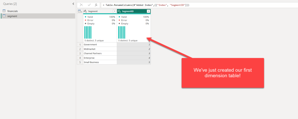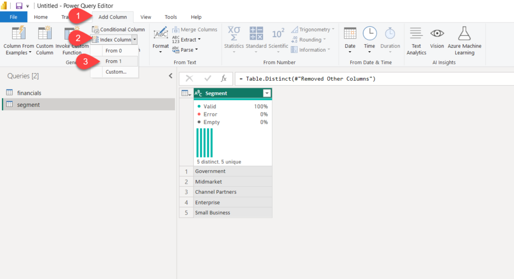 In the Add Column tab on the top, choose Index Column, and then set it to start from 1. Finally, rename the newly created index column to something more meaningful, like SegmentID or SegmentKey.