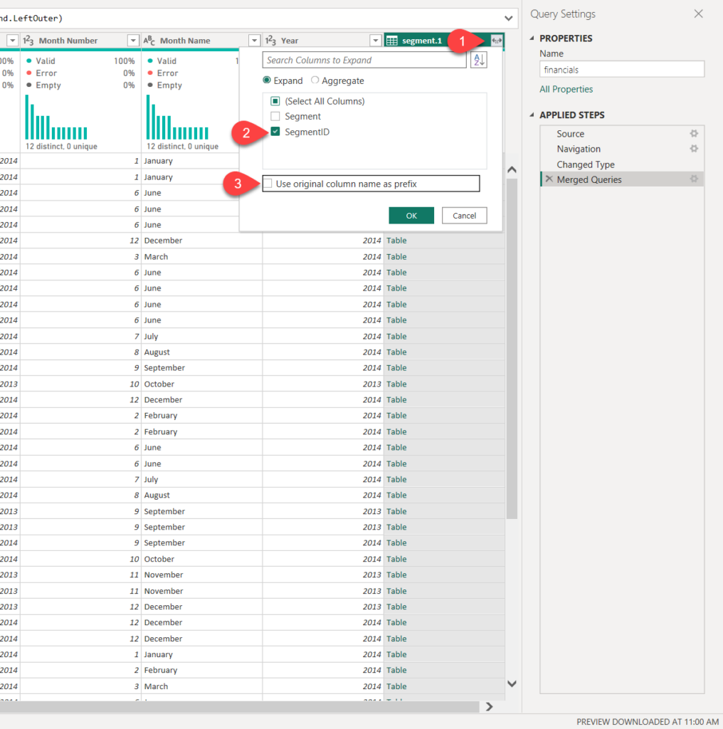 As soon as you confirm table merge, scroll all the way to the right and identify the segment.1 column. Click on the expand icon in the right corner, and then choose only the SegmentID column. Finally, uncheck the option for keeping the original column name as prefix: