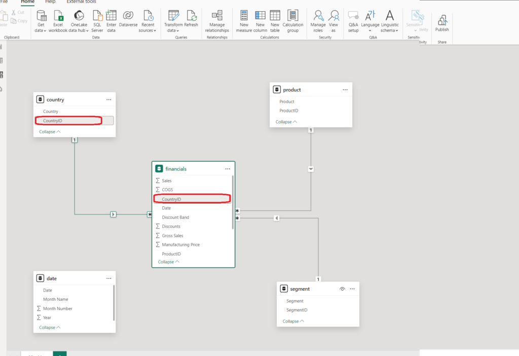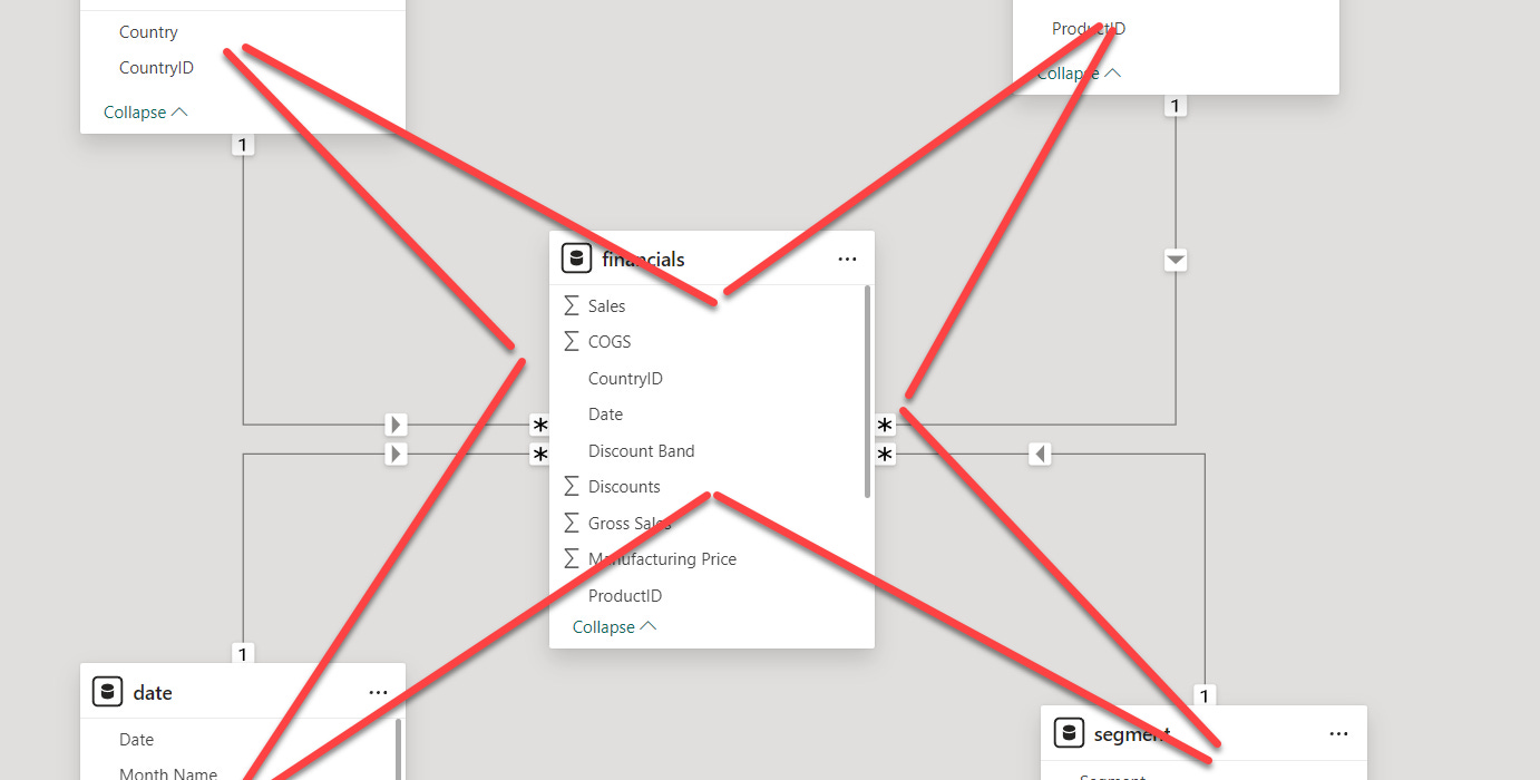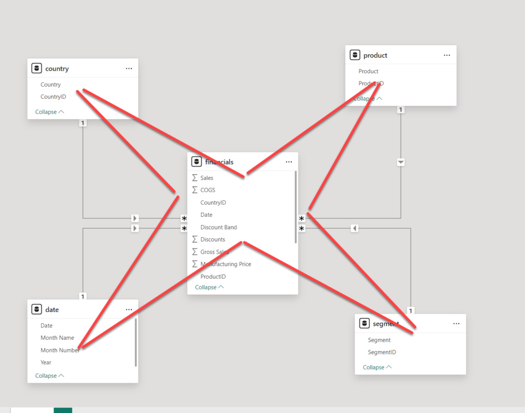 Oh, this looks (almost) like a star! As you may notice, Power BI recognized common fields between fact and dimension tables, except for the date table. So, let’s manually create a relationship between the date table and financials: