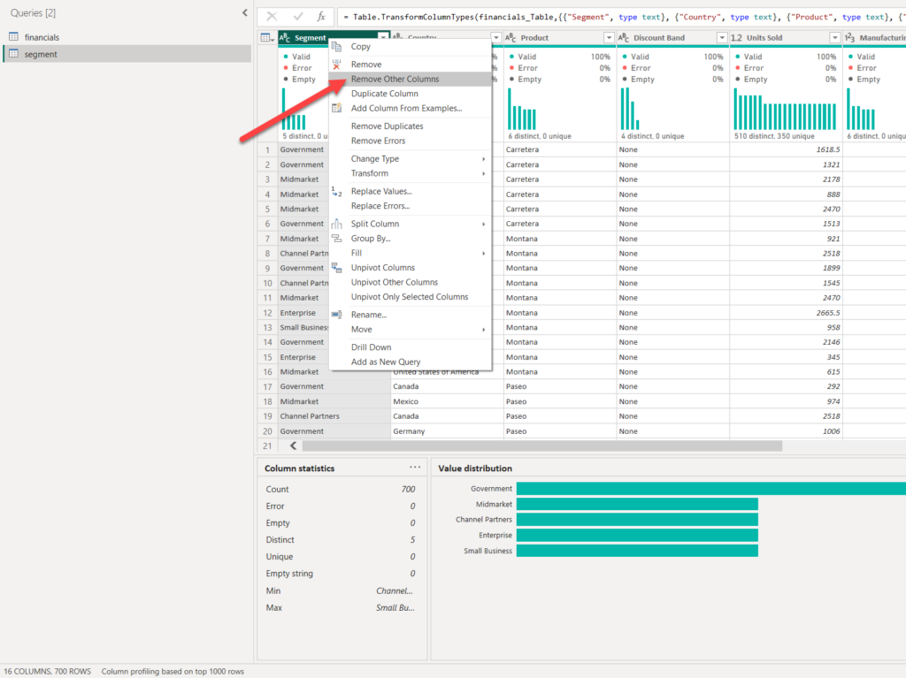 I’ll rename the duplicated query to “segment”. Then I’ll right-click on the Segment column and choose Remove Other Columns: