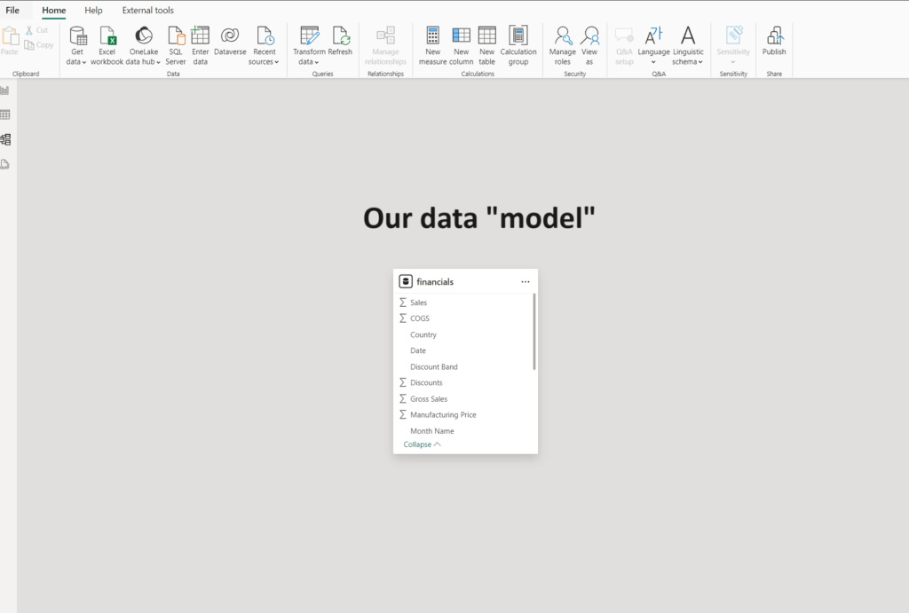 Once you connect and load the data into Power BI, let’s do a quick tour and understand the structure of our data model. Although, in full honesty, this can hardly be considered a model, since we have a single table, and no relationships at all!