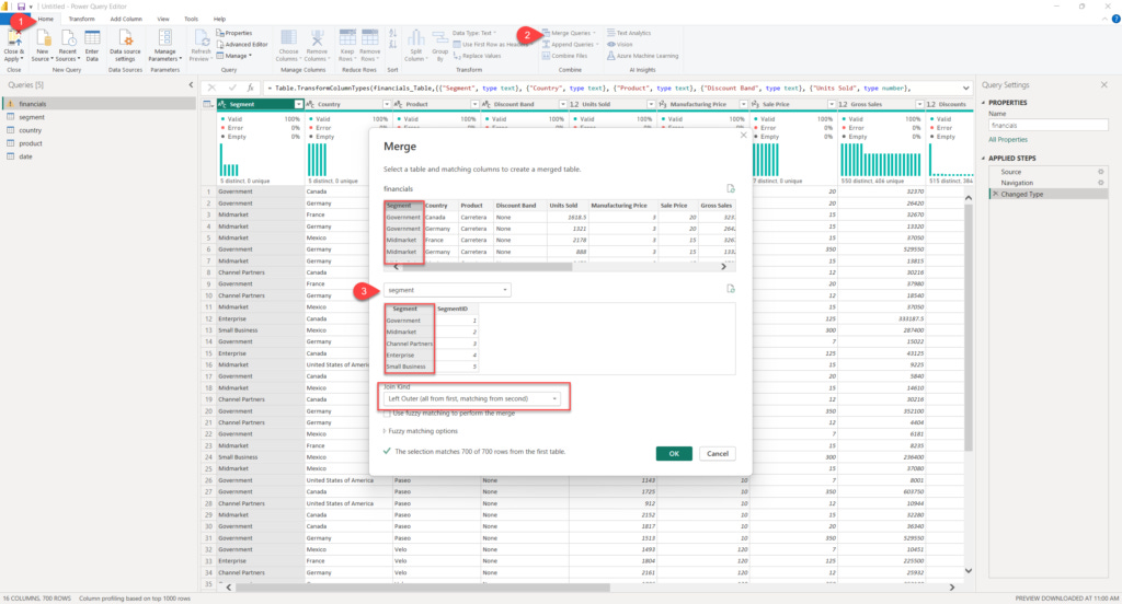 Apply the same steps for country and product tables. DON’T APPLY merge operation for the date table, since our fact table (financials) already contains a date column, which we will use as a relationship key.