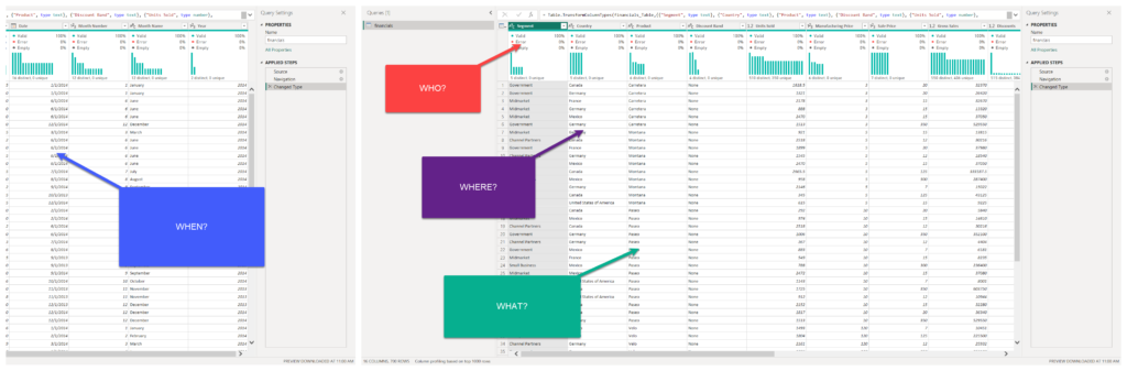 I’ll first open Power Query Editor, and identify columns that should be considered “descriptive” because they are the best candidates for dimension attributes. A quick look at our dataset, and we can spot at least four “lookup” columns: