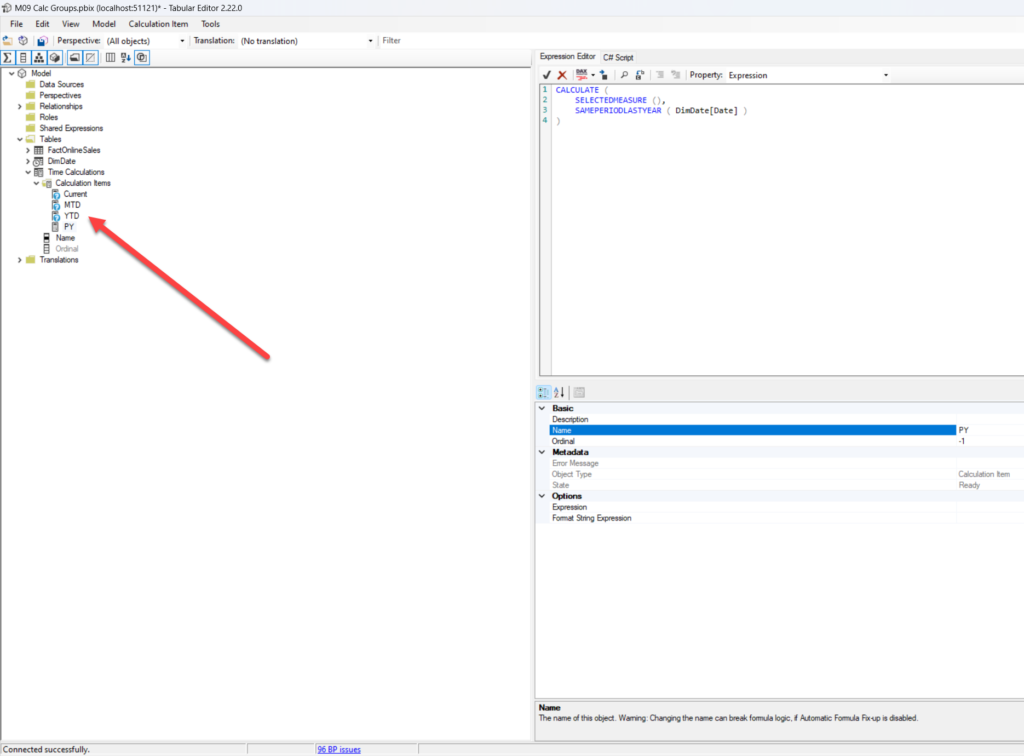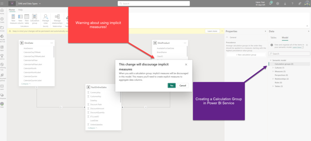 Don’t be scared if you see the warning like in the illustration above. The first important prerequisite for leveraging Calculation Groups, is that you need to use explicit measures! Although, I sincerely hope you are creating explicit measures anyway, nevertheless of the Calculation Group use cases:)