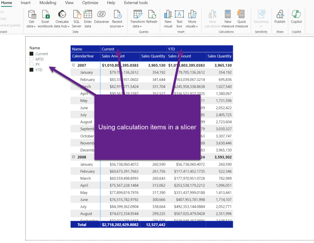 As you see, I have two base measures, Sales Amount and Sales Quantity. Now, if I want to provide information about the values for Month-to-date/Year-to-date/Previous year, I would have written additional 3 measures for Sales Amount, plus additional 3 measures for Sales Quantity.