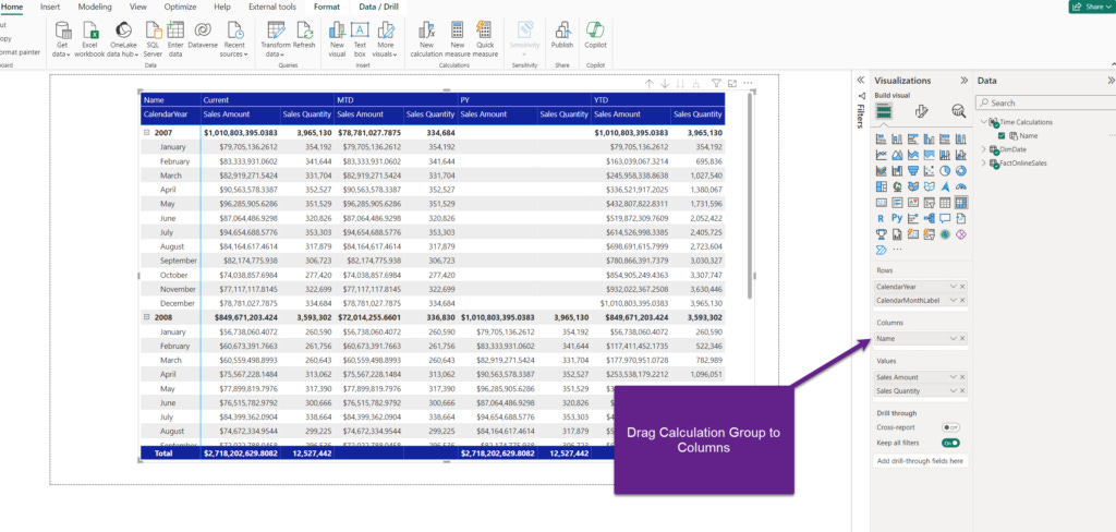 Voila! Once I drag the Calculation Group column to the Columns field of my matrix, I’m able to see all the calculations I defined in the Tabular Editor.