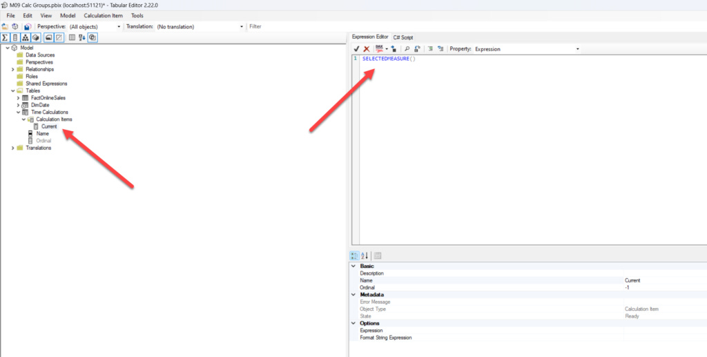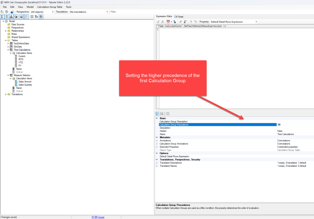 SUM(FactOnlineSales[SalesAmount])The important thing here is to set the proper precedence of the calculation groups! This is the property that defines the order of evaluation of the calculation groups, when you have multiple calculation groups in your data model. So, I’ll set the precedence of the Time Calculations group to 10 (higher precedence than the Measure Selector group):