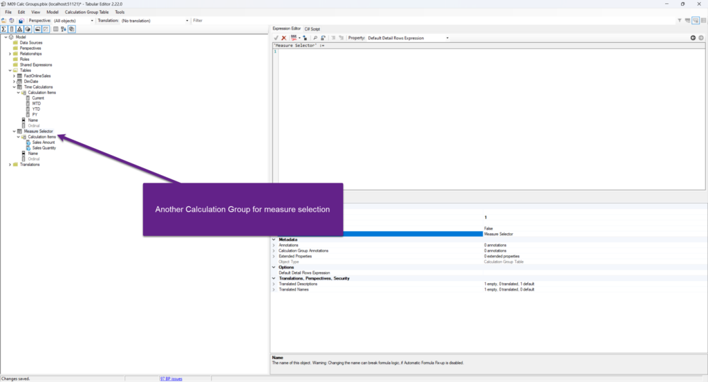 In the following illustration, you can see that I’ve created another calculation group, called Measure Selector, where I’ve just defined two calculation items based on my base measures: