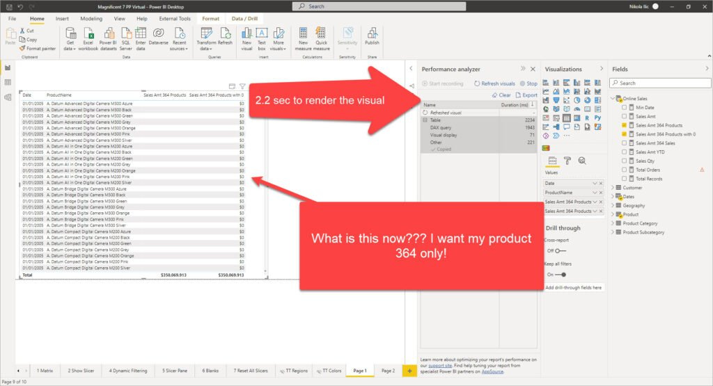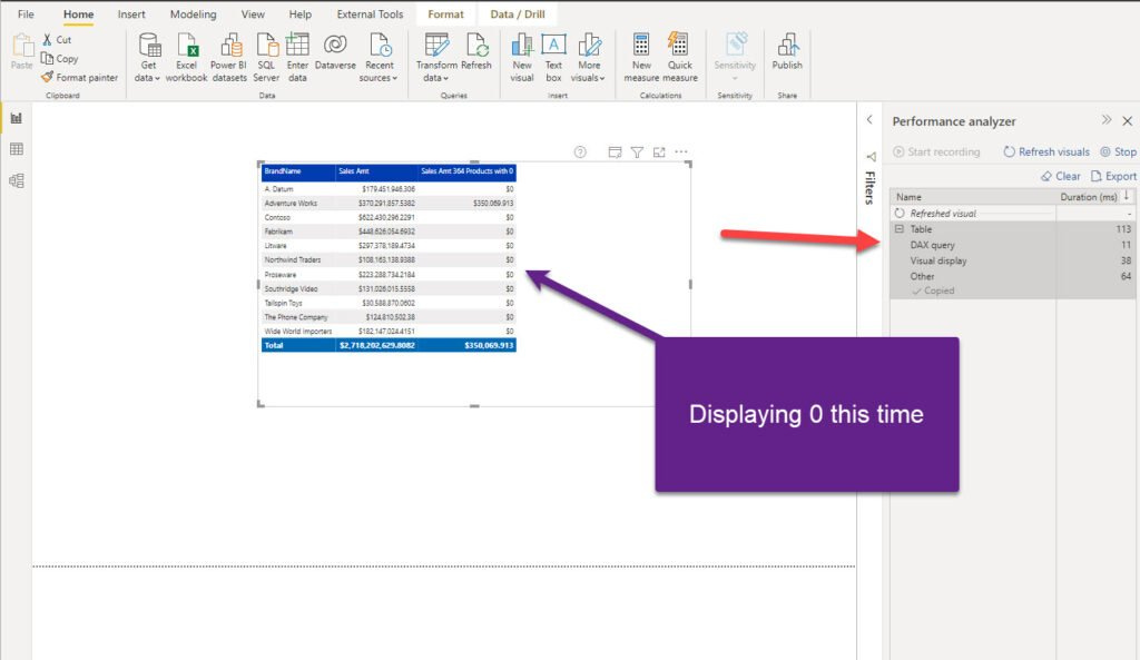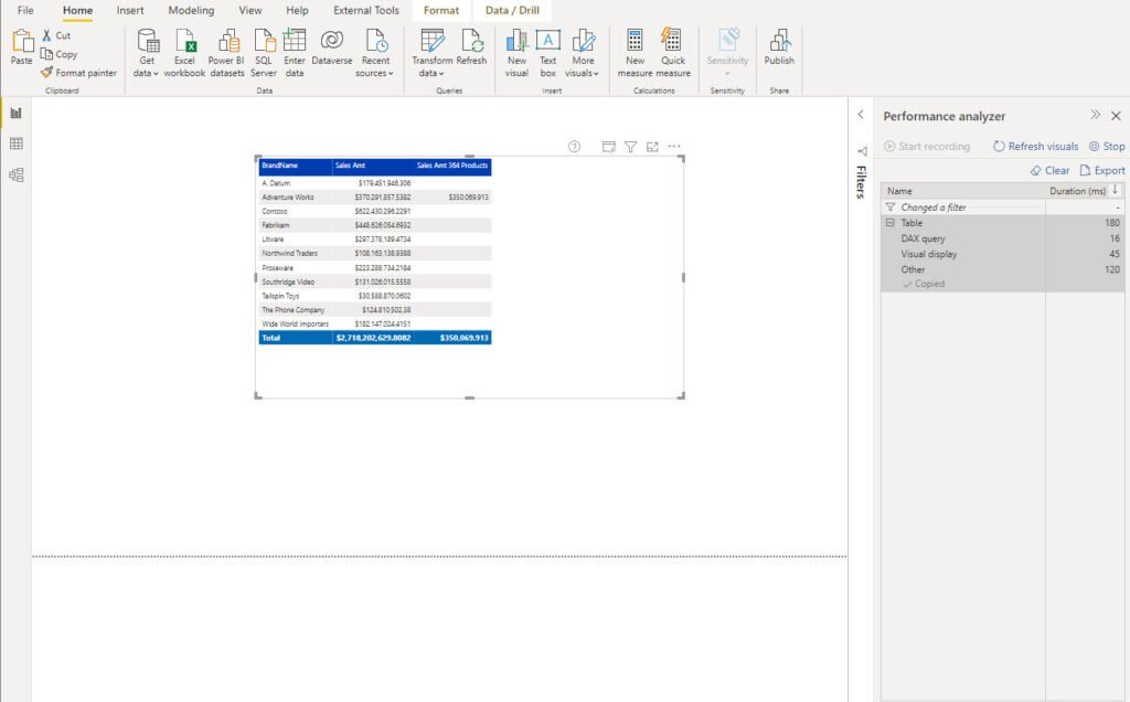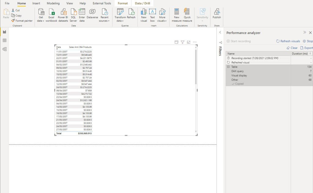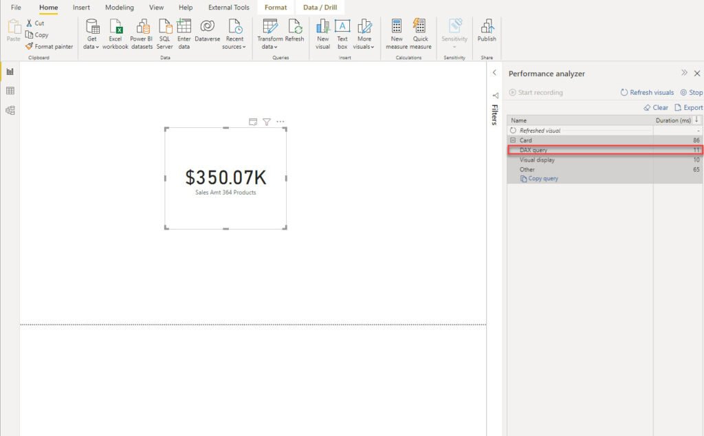 Using this measure, I want to calculate the total sales amount for the product with ProductKey = 364. And, if I put the value of this measure in the Card visual, and turn on Performance Analyzer to check the times for handling this query, I get the following results: