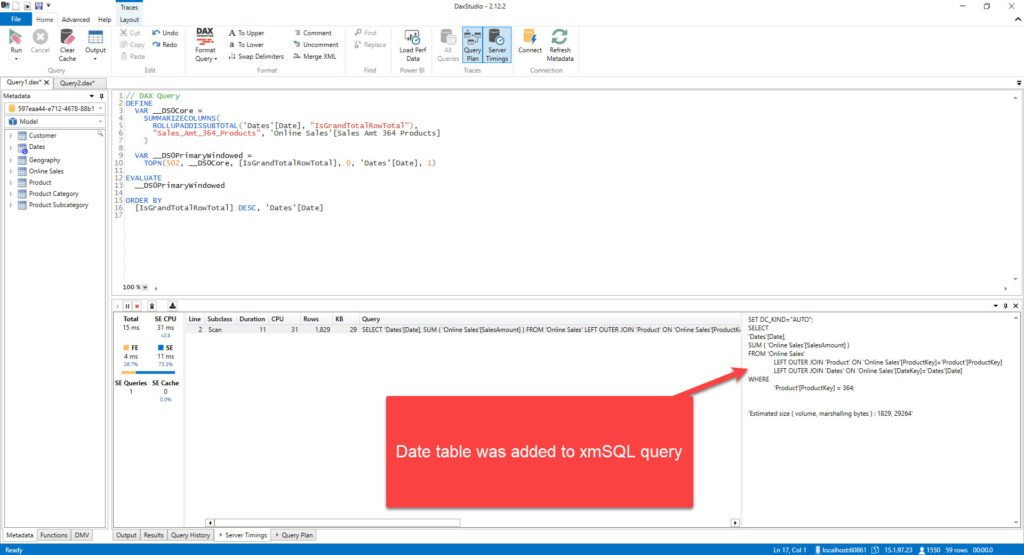 This is because Formula Engine was smart enough to eliminate the dates where product 364 had no sales using the NonEmpty filter, and that’s why the number of records is 58: we have 58 distinct dates where sales of product 364 were not blank: