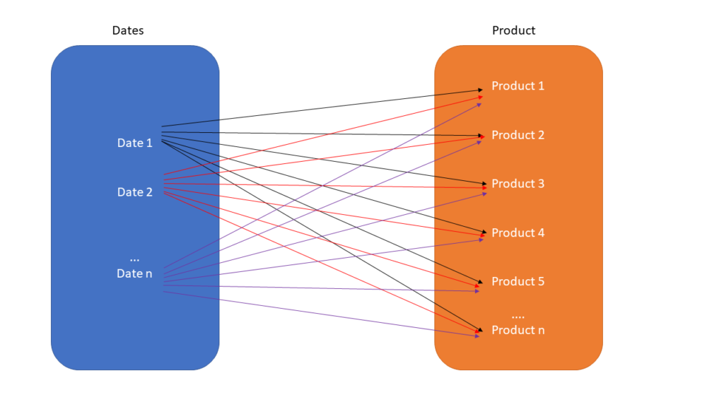 This will display the blank cells too, but without performing a full cross-join between the Product and Dates tables: