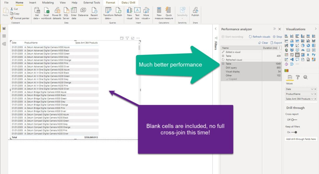 4.6 million records?! Why on Earth does it happen?! Let me do the math for you: 2.517 * 1.826 = 4.596.042…So, here we had a full cross-join between Product and Dates tables, forcing every single tuple (combination of date-product) to be checked! That happened because we forced the engine to return 0 for every single tuple that would otherwise return blank (and consequentially be excluded from scanning)!